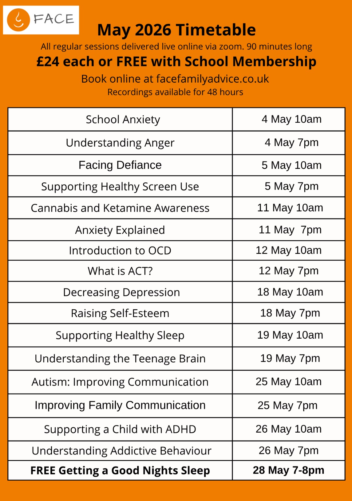 FACE May Timetable